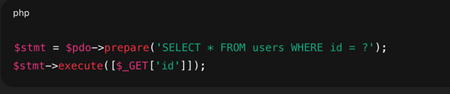 - Parameterised Queries: Use APIs that avoid an interpreter entirely or provide a parameterised interface. This includes using prepared statements (with parameterised queries) for database access. Parameterisation ensures that user input is always treated as data and can never be interpreted as part of the command.