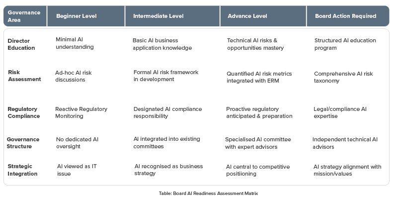 - Board Composition: Does the board possess sufficient technology expertise for effective AI oversight? Should the organisation recruit directors with AI backgrounds, or can existing directors develop necessary competencies through education?
