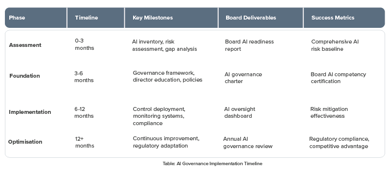 Boards that treat AI governance as a future consideration risk being overwhelmed by regulatory requirements, competitive disadvantages, and unforeseen risks. Conversely, those that invest in AI literacy, governance frameworks, and oversight capabilities position their organisations to capture AI's transformative benefits while managing inherent risks responsibly.