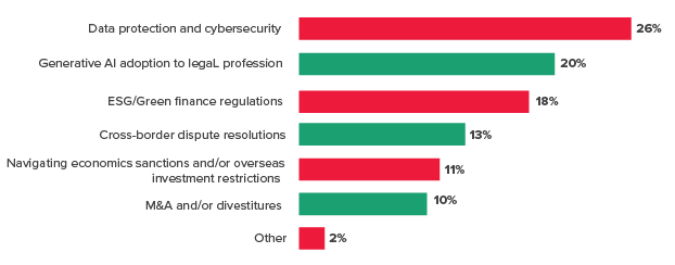 In the inaugural Asia Legal Priorities Report 2024 by Thomson Reuters, which gathers insights from nearly 250 legal professionals, including 108 in-house counsel and 138 private practice lawyers, the following were cited as their top concerns: